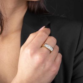 in oro giallo e bianco 18kt, impreziosito da una fascia di diamanti taglio baguette per ct 1.10 circa, punzoni 750 e del fabbricante, mis. 57, gr. 8