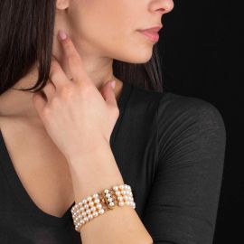 realizzato ad ampia fascia, composto da quattro fili di perle di mm 7 circa, fermatura con lavorazione a cordicella in oro 14kt, lungh. cm 20, gr. 59