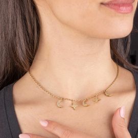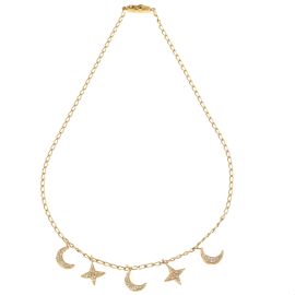 in oro 18kt, da cui pendono cinque ciondoli a forma di lune e stelle impreziositi da diamanti taglio huit huit per ct 1 circa, punzoni 750 e del fabbricante, lungh. cm 38, gr. 9