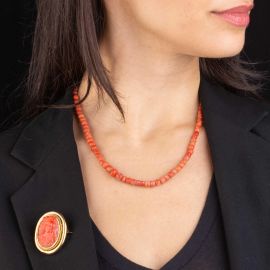 ad un filo di barilotti in corallo digradanti di mm 8-4 circa, fermatura in oro a basso titolo, lungh. cm 46, accompagnata da una spilla ovale in oro giallo 18kt con al centro un cammeo in corallo inciso raffigurante un busto femminile, dim. cm 3,5x4 circa, gr. 37 complessivi