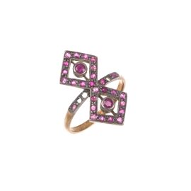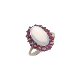 di cui uno in oro bianco 18kt, con al centro una pietra di luna taglio cabochon circondata da una fila di rubini taglio rotondo per ct 1.30 circa, mis. 50, accompagnato da un secondo anello in oro e argento raffigurante un motivo geometrico, impreziosito da rubini taglio rotondo (alcuni mancanti) per ct 0.60 circa, mis. 55, gr. 8