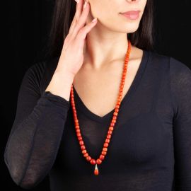 ad un filo di barilotti in corallo digradanti da mm 10x11 a mm 6x6 circa, con pendente a goccia in oro a basso titolo e corallo, fermatura a cilindro in oro giallo 18kt, lungh. cm 79, gr. 77