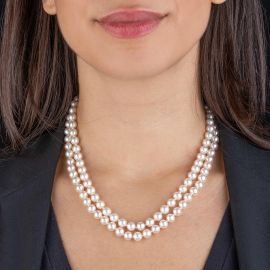 composta da un doppio filo di perle di mm 7 circa, fermatura a moschettone in oro giallo e bianco 18kt impreziosita da diamanti taglio vecchio per ct 0.10 circa, lungh. cm 45, gr. 66. Corredata di scatola e garanzia d'acquisto.