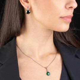 in oro brunito, impreziositi da due pietre sfaccettate in ematite e diamanti taglio brillante per ct 0.50 circa, firmati "Lucia Giovannetti", dim. cm 1,5x2,5, gr. 7 complessivi, accompagnati da una collana composta da catena in argento e pendente in oro e argento impreziosito da diamanti taglio brillante ed un elemento esagonale in calcedonio, lungh. cm 47, gr. 4