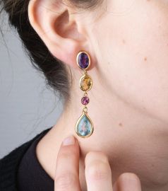 in oro giallo 18kt, impreziositi da quarzi citrini, ametiste e tormaline taglio fantasia, chiusura a clip, dim. cm 1x5,5, gr. 17 complessivi