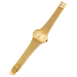 cassa ottagonale in oro giallo 18kt, fondello a pressione, corona marcata, quadrante champagne, indici applicati con smalto nero, movimento a carica manuale, bracciale a maglia tessita in oro giallo 18kt, lungh. cm 17, chiusura a scomparsa marcata Zenith in oro giallo 18kt, vetro plastica, gr. 56. Dim. mm 23x18