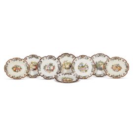 in maiolica dipinta in policromia “alla frutta barocca”, composto da 10 piatti (diam. cm 24), 2 vassoi circolari (diam. cm 28,6), 1 vassoio ovale (cm 29,2x34,5) e 2 vassoietti ovali (cm 21,2x24,2)