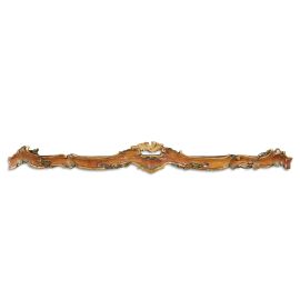 in legno laccato in policromia, con elemento centrale dorato lavorato a giorno su fascia impreziosita da volute dorate e tralci fioriti; cm 16x140x17