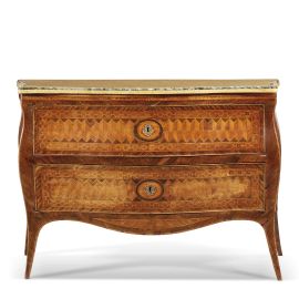 lastronati in legni vari, con piano in marmo in giallo con profilatura in marmo verde, sotteso da fronte di linea bombata presenta due cassetti intarsiati in essenze varie, centrati da motivo circolare e bocchetta e terminante in piccola pendaglina curvilinea; i fianchi di linea analoga con motivo a medaglione, gli angoli prominenti terminano in sottili gambe; cm 97,5x142,5x68,5 e cm 98x143,5x68,5
