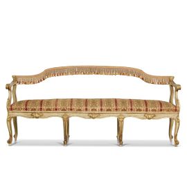 in legno intagliato e dorato e laccato color crema, schienale a giorno impreziosito da fascia con nappette, braccioli a voluta con motivi fogliacei dorati, pendaglina di linea mossa intervallata da intagli dorati riposante su otto gambe mosse terminanti a ricciolo, rivestito in velluto; cm 92x204x51