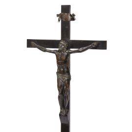 Questo esemplare, ascrivibile alla produzione seicentesca del Centro Italia, trova affinità con i modelli di Antonio Susini, Giovanni Francesco Susini e di Ferdinando Tacca. Il Cristo è qui rappresentato nella tipologia triumphans. La particolare resa del corpo del Cristo, con i bicipiti esili, la lavorazione delle vene vene sulle braccia tese, il costato ben visibile, la tipologia di aureola polilobata e traforata così come anche la struttura lignea, che vede il crocifisso di forma allungata e poggiante su base intagliata con plinti e balaustri a tutto tondo, conferma la sua derivazione toscana, che trova a sua volta ispirazione nel crocifisso del Giambologna della Santissima Annunziata.