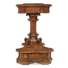 in noce e radica di noce, presenta colonna poligonale impreziosita da intagli a voluta sostenente piano di linea spezzata con piccola modanatura sopra fascia con cassetto, pedana sottesa da fascia di linea serpentina con piedi a doppia mensola e cassettino; cm 85x58x52