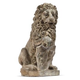in terracotta, il leone rirpoduce la tipologia del Marzocco recante stemma sotto la zampa destra; cm 56x43x28