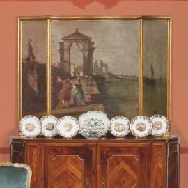 a tre ante dipinte su tela con veduta veneziana in stile di Francesco Guardi, cm 120x155x13,5