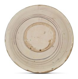 in maiolica dipinta in policromia, forma piana leggermente concava con orlo arrotondato e piede ad anello appena rilevato. La superficie è interamente ricoperta dalla decorazione policroma, mentre sul retro il piatto mostra tre linee concentriche in manganese. Al centro della composizione uno sbandieratore avanza verso la sua sinistra tenendo nella mano destra un grande vessillo; sullo sfondo il classico paesaggio con due picchi arrotondati posti ai suoi lati e un alberello sulla destra; diam. cm 32,2