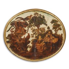 in legno di forma ovale, decorati ad arte povera con galanterie e scene di caccia, entro cornice dorata; cm 53x61,5