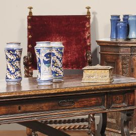 in maiolica decorata in policromia con motivo araldico sul fronte, corpo cilindrico con base carenata e piede piano definito a stecca, spalla stretta e angolata, bocca ampia con orlo appena estroflesso. La superficie è interamente ricoperta da smalto color crema azzurrato, su cui è tracciato un motivo a nastri ripiegati dal profilo netto, delineati a risparmio su fondo blu, mentre sul fronte campeggia un emblema con un braccio che porta tre boccioli, sotto al quale è dipinto il cartiglio anepigrafo; alt. da cm 28,5 a cm 27,5