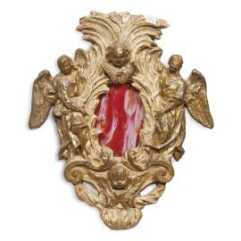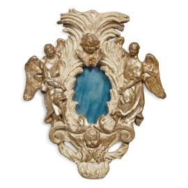 in legno intagliato, laccato e dorato, vetro colorato di forma circolare racchiuso entro intaglio di cherubini ai centri superiore ed inferiore ed impreziosito da motivi fogliacei ed angeli ad ali spiegate ai lati; cm 51x44