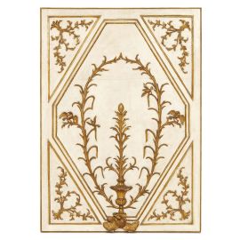 in legno laccato colore crema e dorato, a riserve geometriche che racchiudono racemi con uccelli che racchiudono balaustro da cui si diparte un ramo fogliaceo con finale a pigna; cm 102x140x12,5 e 144,5x102x12,5