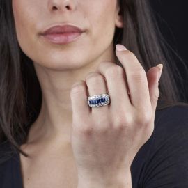in oro bianco 18kt, impreziosito da cinque zaffiri taglio carré per ct 1.70 circa circondati da pavé di diamanti taglio brillante per ct 2 circa, mis. 56, gr. 11
