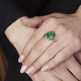 in oro bianco 18kt, impreziosito da una giadeite incisa di ct 2.50 circa, mis. 62, gr. 3. Corredato di certificato GCS del 03/05/2022 attestante le caratteristiche e l'assenza di sostanze impregnanti.