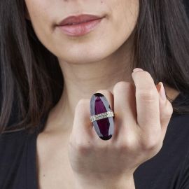 in oro giallo e bianco 18kt, fascia dal design geometrico, sormontata da una grande ametista taglio ovale di ct 36 circa cinta da una doppia fila di diamanti taglio brillante per ct 0.40 circa, punzone 750, mis. 49, gr. 24