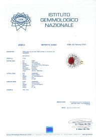 in oro giallo e bianco 18kt, impreziosito al centro da un rubino taglio ovale di ct 3.20 circa, affiancato da due diamanti taglio a cuore per ct 1.20 circa, circondato da pavé di diamanti taglio brillante per ct 2.30 circa, colore G/H, purezza IF/Vs, punzoni 750 e 18kt, mis. 55, gr. 11. Corredato di certificato IGN del 28/02/2023 attestante le caratteristiche e l'origine geografica del rubino.