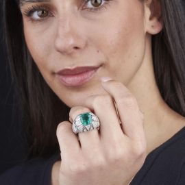 in oro bianco 18kt, con al centro uno smeraldo colombiano taglio ottagonale di ct 4.79, circondato da diamanti taglio baguette per ct 1.30 circa e da diamanti taglio brillante (di cui due sintetici) per ct 2.60 circa, punzoni 750 e del fabbricante, mis. 53, gr.18. Corredato di certificato IGN del 08/03/2023 attestante le caratteristiche e l'origine della pietra.