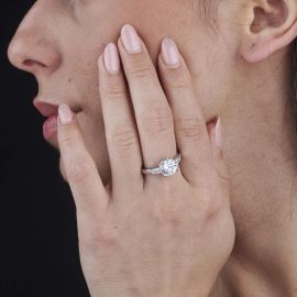 in platino, al centro un diamante taglio brillante di ct 3.02, colore E, purezza Vs1, affiancato da due diamanti taglio tapes per ct 0.40 circa, firmato "Bulgari", punzoni 750, del fabbricante e n. seriale, mis. 58, gr. 8. Corredato di scatola e certificato GIA del 17/05/2007 attestante le caratteristiche.