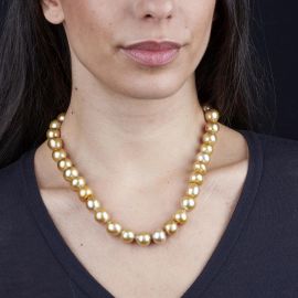 composta da un filo di perle south sea di forma barocca leggermente digradanti di mm 13-12 circa, fermatura a forma di sfera in oro giallo e bianco 18kt, punzoni 750 e del fabbricante, lungh. cm 48, gr. 119