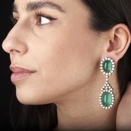 in oro bianco 18kt, ciascuno impreziosito da due smeraldi taglio cabochon per ct 55.70 circa, circondati da diamanti taglio brillante per ct 7.80 circa, punzone 750, dim. cm 2x6,5 circa, gr. 42 complessivi. Corredati di certificato IGN del 22/12/2022 attestante le caratteristiche.