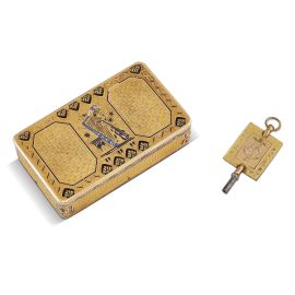 in oro giallo, di forma rettangolare con angoli arrotondati, decorata lungo tutto il profilo da tralci realizzati a rilievo e in smalto nero che vanno a incorniciare dei riquadri centrali raffiguranti piccole foglie su sfondo guilloscé, con al centro degli strumenti musicali circondati da rami fioriti. La base reca all'interno il movimento di un carillon funzionante tramite la rotazione di una leva con apposita chiave, punzoni francesi, dim. cm 8x5x2 circa, gr. 213. Corredata di scatola e chiave di carica.