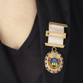 in oro giallo 18kt, composta da lembo in tessuto e ciondolo pendente con lo stemma smaltato del consiglio comunale della città di Sheffield, raffigurante: la scritta "Con l'aiuto di Dio il nostro lavoro ha successo", tre covoni di grano su un campo verde e un fascio di frecce. Il tutto sormontato da un leone rampante, incorniciato da pietre sintetiche taglio rotondo, punzoni inglesi sul pendente e 750 sulla spilla, dim. cm 3,5x9,5, gr. 29