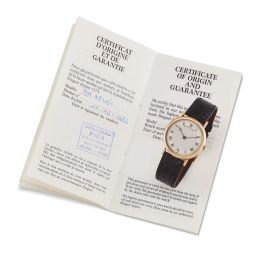 cassa in oro giallo 18kt, fondello a pressione, lunetta liscia in oro giallo 18kt, quadrante argenté, numeri romani, lancette breguet, movimento a carica manuale cal 818/4, cinturino non originale in pelle nera lucida, fibbia in oro giallo 18kt non originale, vetro minerale, gr. 37. Diam. mm 31. Corredato di garanzia.