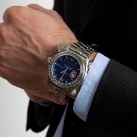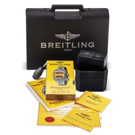 cassa in titanio, fondello serrato con viti, ghiera girevole con coordinate di geolocalizzazione, anse con antenne di trasmissione del segnale radio da azionare in caso di emergenza, quadrante blu con orario analogico e digitale, funzioni di orario locale, secondi, giorno e data, timer, secondo fuso orario, cronografo e allarme-sveglia, grafica bianca, movimento al quarzo, bracciale a maglie in titanio, lungh. interna cm 20, chiusura a scomparsa marcata Breitling, vetro minerale. Diam. mm 43. Corredato di scatola, garanzia, libretto di istruzioni e tester di emissione di frequenza.