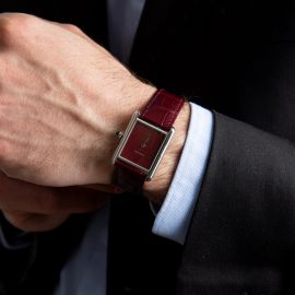 cassa in acciaio, fondello serrato con viti, corona con pietra cabochon blu, quadrante borgogna, grafica argento, movimento al quarzo, cinturino originale in pelle bordeaux, fibbia in acciaio marcata Cartier, vetro minerale. Dim. mm 25x35. Corredato di scatola e garanzia.