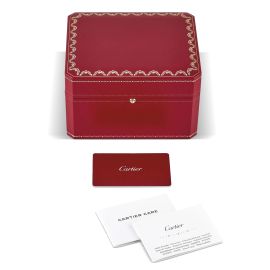 cassa in acciaio, fondello serrato con viti, corona con pietra cabochon blu, quadrante argenté, grafica nera, numeri romani, datario a ore sei, movimento a carica automatica, bracciale a maglie in acciaio, lungh. interna cm 17, chiusura doppia deployant in acciaio marcata Cartier, vetro minerale. Dim. mm 30x42. Corredato di scatola, garanzia e due maglie aggiuntive.
