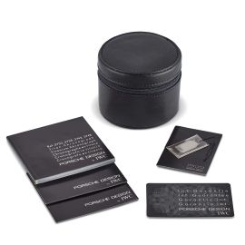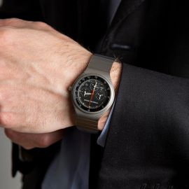 cassa in titanio, fondello serrato a vite, quadrante nero con scalino e scala tachimetrica, grafica bianca, indici applicati, datario tra ore quattro e ore cinque, contatore dei secondi a ore sei, contatore dei minuti a ore nove, contatore delle ore alle tre, movimento al quarzo, bracciale a maglie in titanio, lungh. interna cm 19, chiusura a scomparsa marcata Porsche Design, vetro minerale. Diam. mm 36. Corredato di scatola e garanzia.