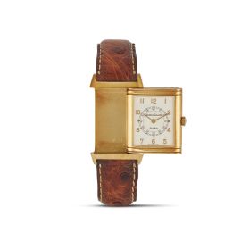 cassa di forma rettangolare in oro giallo 18kt con sistema a scorrimento e alloggio in oro giallo, fondello recante personalizzazione in lettere "G.R.", quadrante argenté, grafica di colore nero, numeri arabi applicati, movimento a carica manuale, cinturino originale in pelle marrone, fibbia deployant in oro giallo 18kt marcata Jaeger LeCoultre, vetro minerale, gr. 55. Dim. mm 28x33