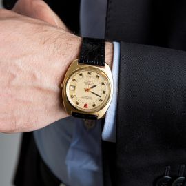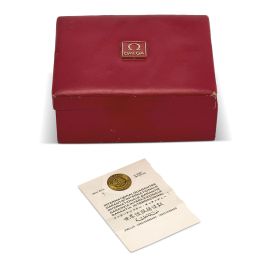 cassa in oro giallo 18kt, fondello serrato a vite, corona marcata, quadrante champagne "OM", grafica nera, indici in oro applicati, datario a ore tre, movimento al diapason cal ESA 9162 - Omega 1250 Bulova design n. 32907936, cinturino in pelle di colore nero non originale, fibbia in acciaio dorato, vetro plastica, gr. 67. Diam. mm 38. Corredato di scatola e garanzia.