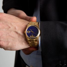cassa in oro giallo 18kt, fondello a vite, ghiera zigrinata in oro giallo 18kt, corona marcata, quadrante lapislazzuli, grafica oro, datario a ore tre con lente cyclope, grande finestra con il giorno della settimana in spagnolo a ore dodici, movimento a carica automatica cal 3055 n.1519667, bracciale president in oro giallo 18kt ref. 8385 finali 55, lungh. interna cm 18, chiusura a scomparsa in oro giallo 18kt marcata Rolex, vetro minerale, gr. 113. Diam. mm 37. Corredato di garanzia.