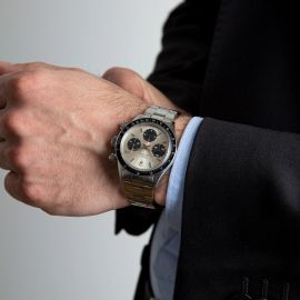cassa oyster in acciaio, fondello serrato a vite, corona marcata, pulsanti a vite, ghiera con inserto nero con scala tachimetrica a 200, quadrante argentè con contatori a contrasto, grafica nera, indici applicati con trizio, scritta Daytona in rosso, contatore dei secondi a ore nove, contatore dei minuti a ore tre, contatore delle ore alle sei, movimento a carica manuale Valjoux 727, bracciale oyster ref. 78350 finali 571 cod. produzione N11, lungh. interna cm 20, chiusura a scatoletta marcata Rolex, vetro plastica. Diam. mm 37. Corredato di scatola e garanzia.