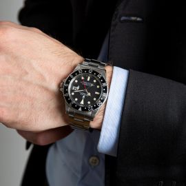 cassa in acciaio, fondello a vite, corona marcata, ghiera girevole con inserto nero, quadrante nero, grafica bianca, indici pallettoni, datario a ore tre con lente cyclope, movimento a carica automatica cal 3075 n. 0727478, bracciale oyster a maglie piene ref. 78360 finali 580, lungh. interna cm 18, chiusura a scatoletta marcata Rolex, vetro plastica. Diam. mm 40