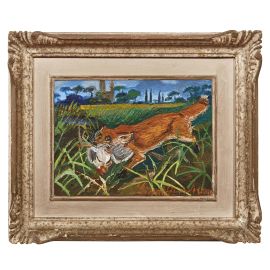 Nell’opera Volpe in fuga, possiamo osservare uno dei soggetti più amati da Ligabue: la volpe che è in fuga tra la pianura e i boschi con la sua preda tra le fauci, il predatore ancora una volta ha vinto sulla vittima. È un’opera che rappresenta a pieno il fantastico e coinvolgente mondo dell’artista, una scenografia magistralmente eseguita, una raffinata tavoletta dalla grande qualità tecnica proveniente da un’importante collezione privata.