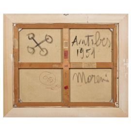 L’opera qui proposta, fa parte proprio del ciclo di opere realizzate nella cittadina della Costa Azzurra, come si evince dal titolo Antibes/Al Molo. Si tratta di un’opera armoniosa e assai rappresentativa del periodo post-cubista e neo-picassiano che hanno caratterizzato la produzione di Moreni a partire dalla seconda metà degli anni Quaranta. Siamo agli esordi di una lunga e articolata carriera artistica.