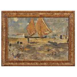 Una brezza leggera immaginiamo accarezzare la spiaggia di Chioggia dipinta del pittore Emilio Gola, ove l’impasto di colore sembra recare con sé il profumo di salsedine. Abile ritrattista, assai apprezzato dalla nobiltà milanese per l’accento mondano e il vigoroso naturalismo della propria pittura, l’artista compì viaggi studio nei Paesi Bassi, in Inghilterra e Parigi, ove conobbe Édouard Manet. La sua spiccata sensibilità luministica e plastica caratterizzerà numerose vedute di Milano e dei paesaggi brianzoli, nonché la produzione ligure e veneta. Ed è certo proprio nelle marine che si impone una grande sintesi formale e intensità espressiva, caratterizzante soprattutto la fase della maturità, in cui è possibile collocare la mirabile veduta della spiaggia Chioggia presentata in catalogo.