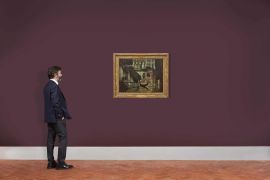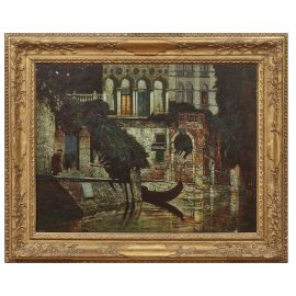 Il suggestivo dipinto presentato in catalogo è opera del pittore bolognese Mario De Maria, incisiva personalità dell’arte simbolista-decadente di fine secolo, in un costante e sinestetico gioco di rimandi alla dimensione musicale e poetica. Affascinato dai “misteri della luce e dell’ombra”, è principalmente dalla luce lunare che il pittore diviene presto quasi ossessionato, tanto da guadagnarsi l’appellativo di ‘pittore delle lune’, capace di svelare ‘l’anima cose’ attraverso visioni, sogni, incubi caratterizzati da un impasto cromatico di sapore rembrandtiano. Prima Roma e poi Venezia sono i terreni d’indagine dell’artista, come testimoniato dalla stessa opera in asta, rappresentante un notturno della città lagunare ed esposta alle Biennali del 1909 e 1926. Il dipinto ha in sé tutta la sapienza luministica del pittore bolognese -spesso paragonato per atmosfere create a Baudelaire e Poe-, catalizzando l’attenzione dello spettatore sulla finestra illuminata per poi lasciare la fantasia vagare sul resto della composizione e le due figure di spalle, alla ricerca del mistero da svelare. L’opera -di cui grazie a un articolo pubblicato nel 1902 sulla rivista “Emporium” conosciamo un’analoga versione- reca data 1906, anno in cui venne acquistata dal senatore Luigi la Torre per intermediazione di Vittore Grubicy, che in una lettera rassicura l’artista bolognese riguardo l’accorta collocazione del dipinto all’interno della collezione: “inchiavardato tra altri molto neri appositamente scelti (di Filippin, l’altro un bosco del poeta pittore Emilio Praga e una macchietta di Tranquillo Cremona) cosicché funzionino da ‘repoussoirs’ e accanto ai quali il tuo diventa luminosissimo e quasi chiaro” (cfr. A. Mazzanti, Simbolismo italiano fra arte e critica. Mario De Maria e Angelo Conti, p.315).