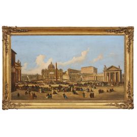 L’autore della cristallina veduta di Piazza San Pietro presentata in catalogo è il pittore Vincenzo Giovannini, trasferitosi giovanissimo da Todi a Roma. Formatosi dunque nella Capitale frequentando i corsi di disegno e pittura presso l’Ospizio di San Michele, l’artista, nonché abile copista, si specializzò presto nella pittura di vedute, assai richiesta da mercanti e in grado di esercitare un intramontabile fascino sui viaggiatori.