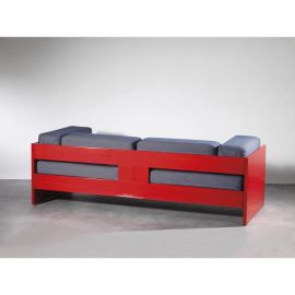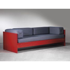 struttura in legno colorato all’anilina rossa, cuscini rivestiti in stoffa nei toni del blu