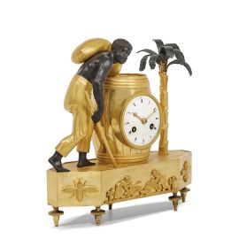Su una base di forma sagomata, decorata da fregi a rilievo, è posto un giovane schiavo di colore intento a versare un sacco di caffè in una botte, nella quale è inserito il quadrante, probabilmente destinata all’imbarco su una nave, con accanto una piccola palma.